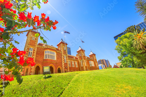 Bougainvillea In Foreground With Sunbeams In Government House Gardens Perth City Government House East Front The Residence Of Governor Of Western Australia On Background Blue Sky Copy Space Buy This Stock